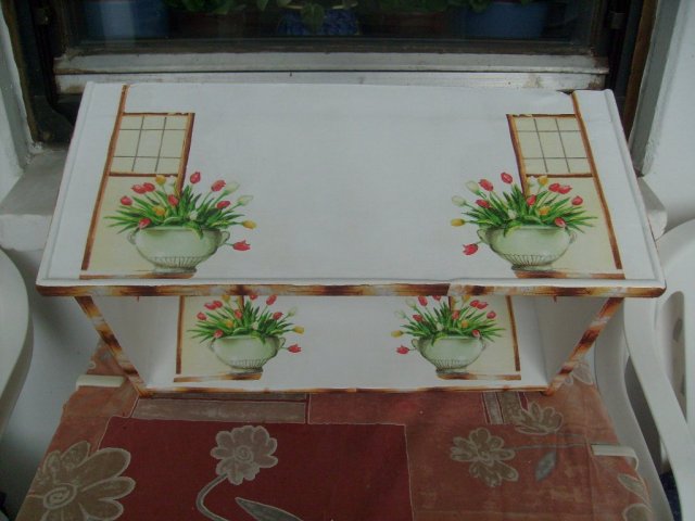 Tako sam ja, diveći se radovima ostalih kreativku, počela da se igram salvetama prvo na kartonskim kutijama, a oonda na drvenim, čak sam i staru policu recikličala.